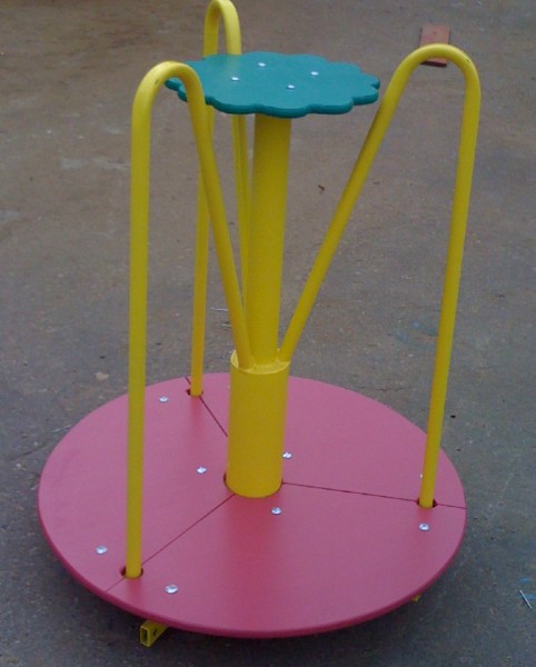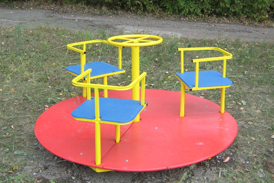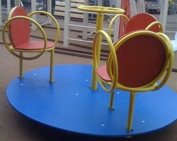 - Дисковые. Конструкция этих аттракционов отличается наличием цельной вращающейся платформы. Они более стойкие и безопасные, чем классические лучевые. Такие карусели качели на детскую площадку оптимально подходят для детского садика.